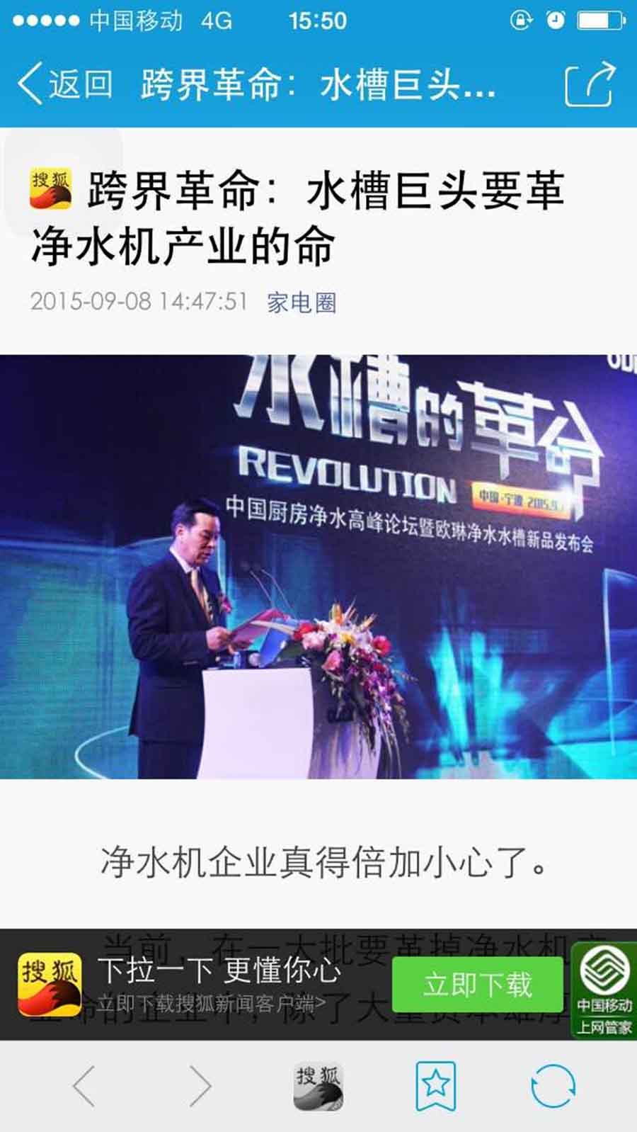 今日頭條、網易、鳳凰、搜狐等近百家門戶、行業類網站進行轉發、報道,《中國家電網》就發文表示:“一個傳統家裝行業企業,将淨水技術做到如此極緻,所謂的‘家庭淨水在廚房,廚房淨水在水槽,水槽淨水在歐琳’,傳統的台下淨水,你們可感受到危機?水槽發明者再次發明水槽!這,就是革命!”