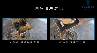 油杯清洗對比(右:歐琳不怕油的大吸力油煙機)