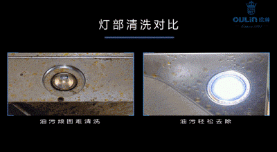 燈部清洗對比(右:歐琳不怕油的大吸力油煙機)