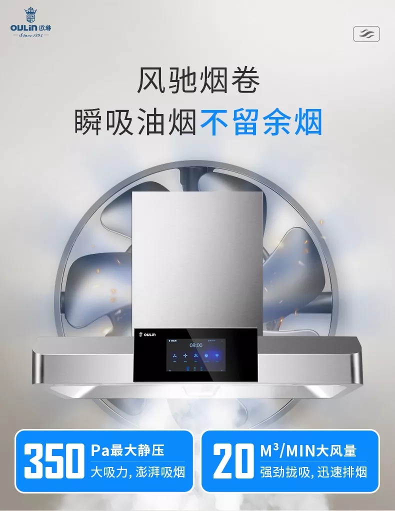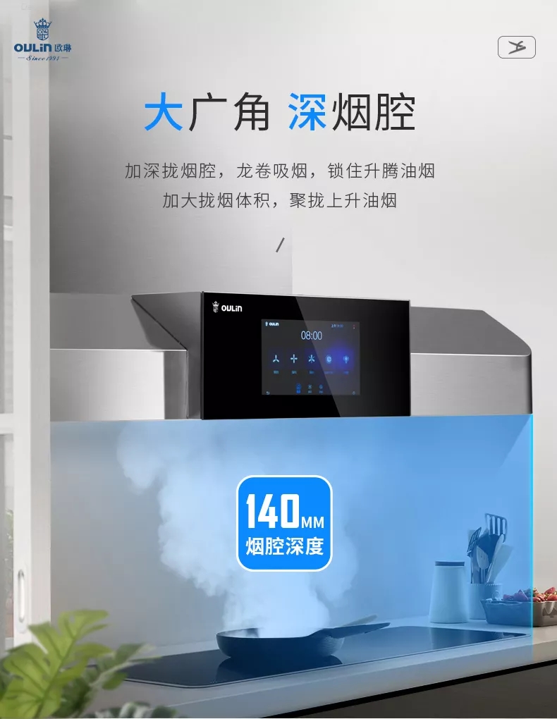除了“智設計”,歐琳這款油煙機還擁有另“2”大産品亮點,“大吸力”、“深攏煙”。