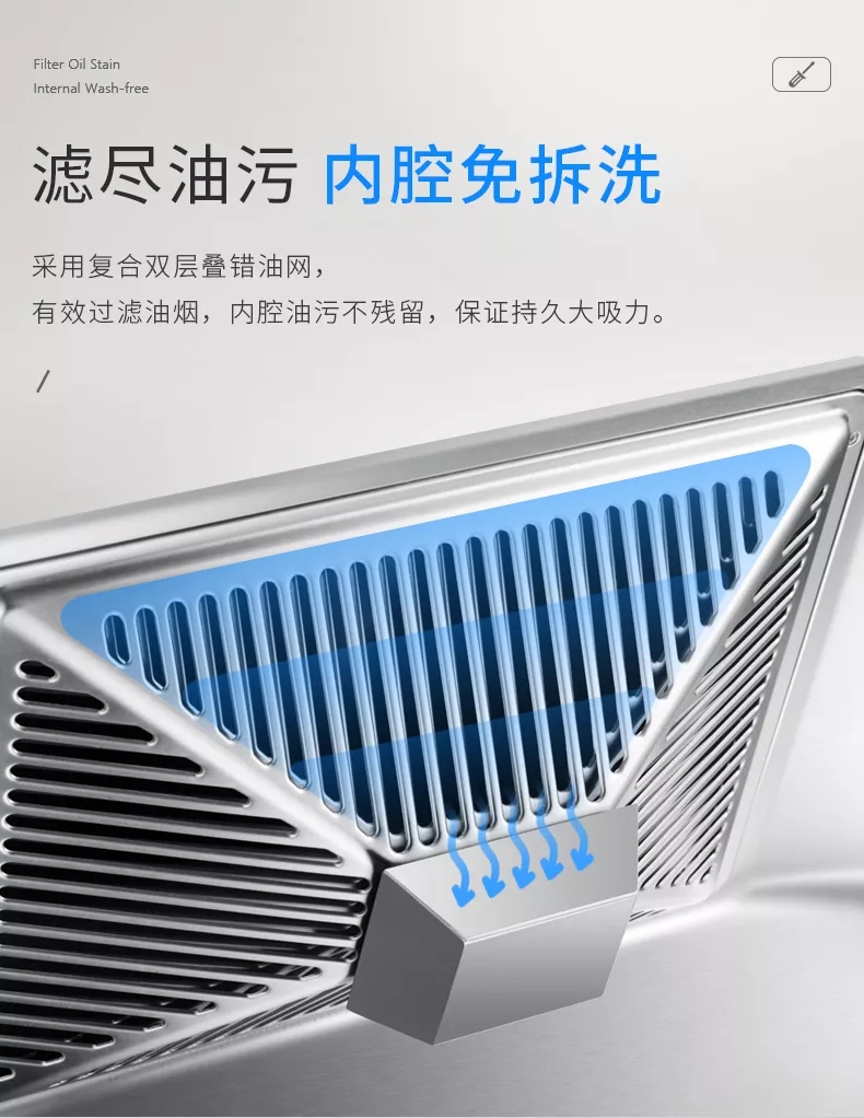 大吸力系統,擁有一顆強“心髒”,能夠提供源源不斷的強動力。同時超大雙子輪設計,有效增大單位時間進風量,進煙效率顯著增大,産生的油煙迅速被吸走,達到順吸暢排的效果。