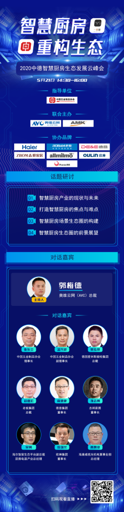 在超過20萬人的共同關注下,本次雲峰會圍繞“智慧廚房産業的現狀與未來、打造智慧廚房的焦點與難點、智慧廚房場景生态圈的構建、智慧廚房生态圈的前景展望”等行業關心的幾大話題展開研讨。