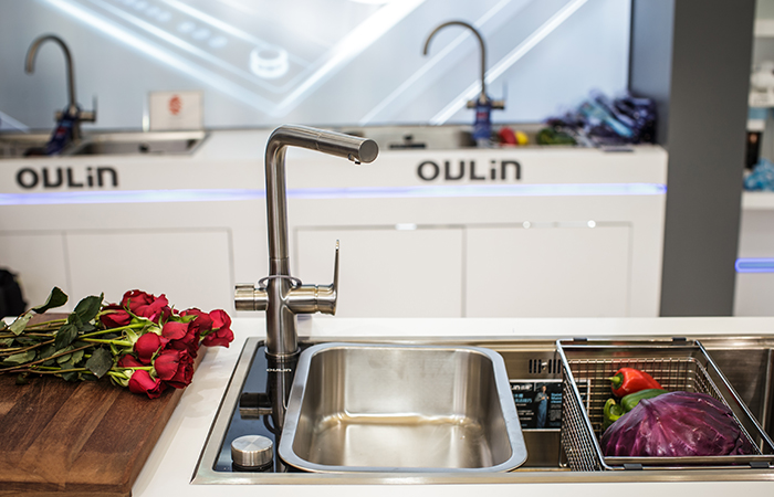 随着新常态下家庭生活需求的不斷膨脹,健康、環保等成為了不容忽視的關鍵詞。水槽作為歐琳最有代表性的産品,除了一貫保證的設計感和品質之外,歐琳更是通過大量的研發科技投入,推出健康智能水槽系列産品,其中“淨水水槽”便是最具代表性的一款跨界整合精品,一經推出便引發行業内廣泛讨論,此次不負衆望亮相展會,更多參展者得以一睹真容。這款将水槽與淨水科學整合的新型廚房神器,規避了淨水産品占用空間、台下操作的不便,并實現台上觸屏控制、濾芯更換提醒、一個龍頭四種出水等人性化功能。