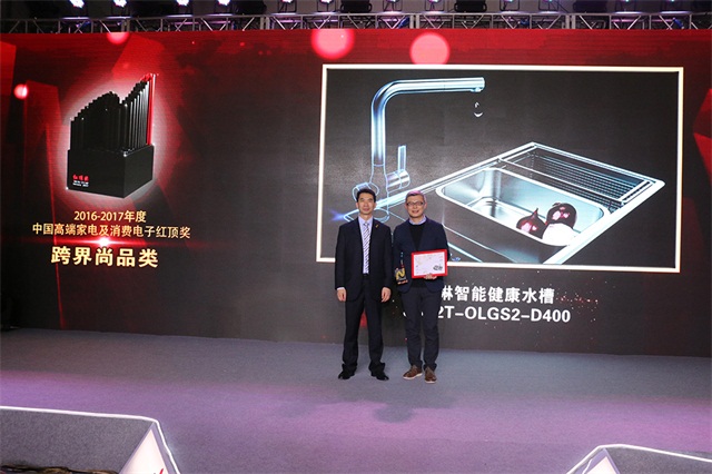 1月14日,由中國家用電器協會指導、紅頂獎組委會主辦的“2016-2017中國高端家電與消費電子趨勢發布暨紅頂獎頒獎典禮如期而至,數十家國内外知名電子與消費電子品牌和上百家中外媒體,共同見證24個紅頂獎産品的誕生。歐琳淨水水槽跨界尚品是盛會唯一一款創意跨界水槽産品。
